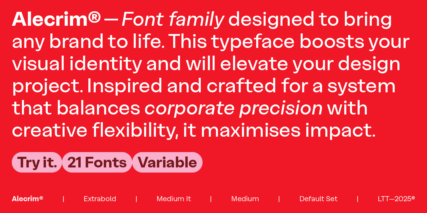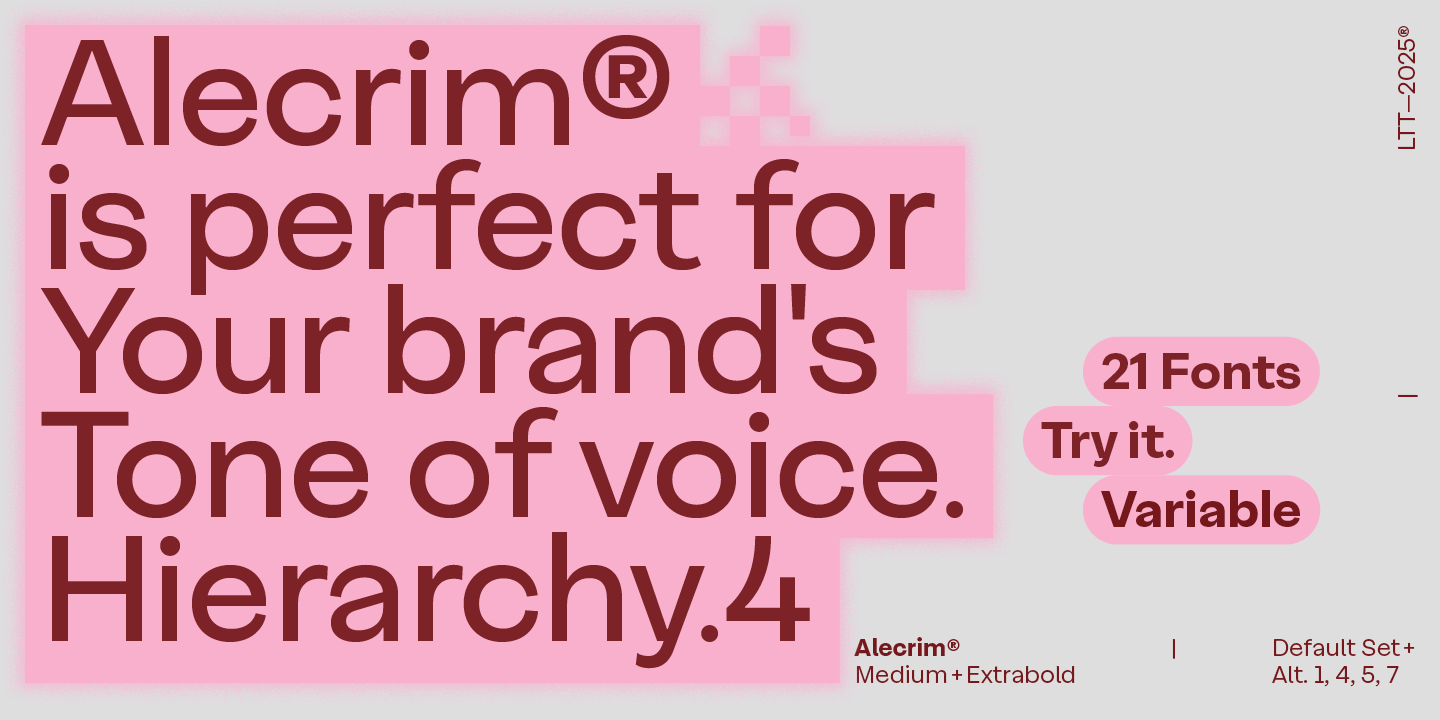 Inspired by 20th‑century grotesques, Alecrim aligns with timeless sans serif classics such as Helvetica, Frutiger, and Franklin Gothic. Its contemporary precision and graphic solidity make it a reliable tool for visual identity, editorial design, and systems that demand clarity, neutrality, and durability.